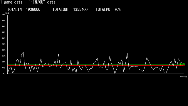 番号は均等に配置され、マスはランダムに初期状態で連鎖しない形をとり、さらに開始時爆弾は0個とし、オッズアップはすでにGETした配当にもかかるとする。(ここは本物とかなり違うので修正すべき部分)このようにいろいろ本物と違うところがあるが、だいたい似ているので、とりあえずこれを超マルチモードで回したときのPO率の推移が以下のグラフとなる。