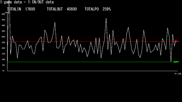 ちなみに、チェーンボンバー大辞典でのカードの配置パターンの順位の中央値が69%程度なので、正規分布とすると平均値と中央値が一致するはずで、我のデータPO70%と比較すると類似している。実はランダムにカードのパターンを組んでもちゃんとそれっぽい挙動を示すという。そして直近の100ゲームを見てもやっぱり全消しをしておらず、意外と全消しは起こりにくいこともわかる。